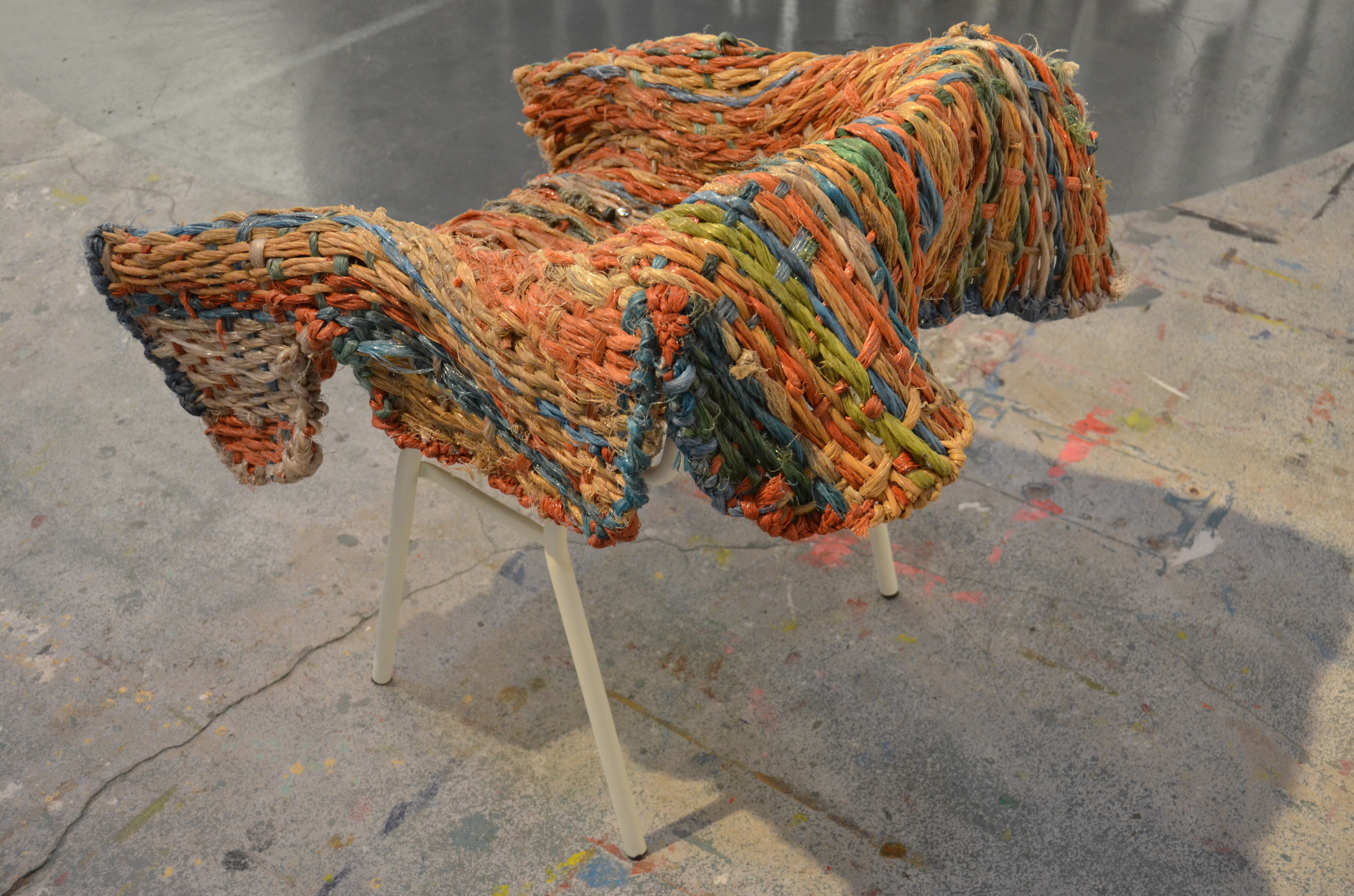 To prove that raw material influenced by natural elements still can be used, I decided to make a seating object. Old fishing ropes were dried, sorted and woven onto a grid. The next step was to put this woven 'mat' into a mould where it was impregnated with resin, and eventually became a shell.